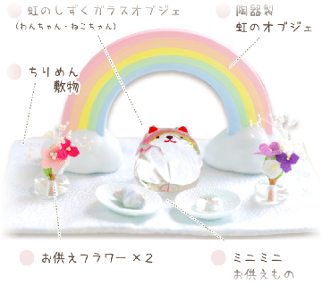 虹色にきらめくガラスのわん・にゃんオブジェが特徴の、愛らしいサイズのミニミニご供養セットです。はじめてでも安心して、とても可愛い祈りの場をお作りいただけます。