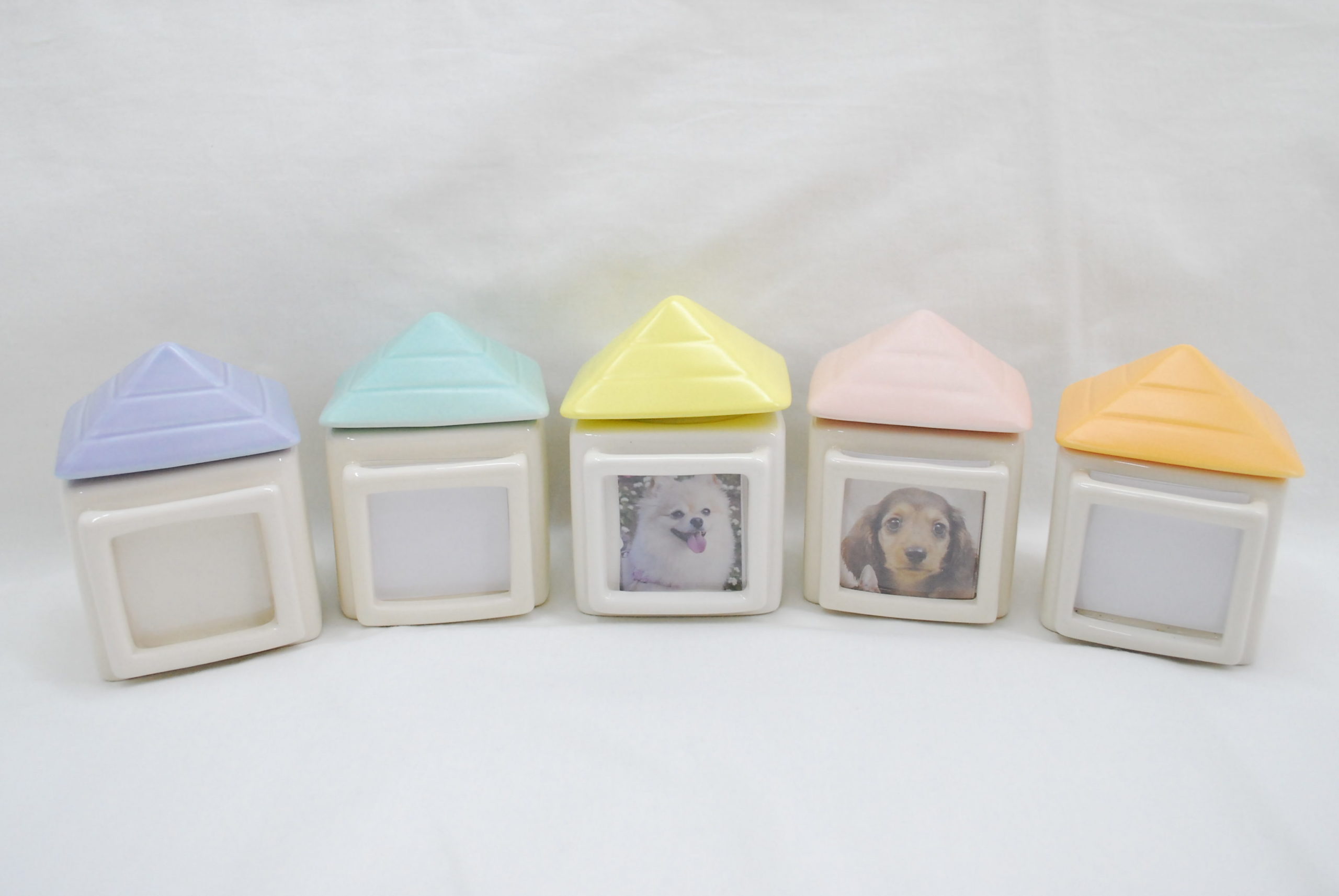 しっとりとした陶器の手触りと優しいパステルカラーの、写真も納められるお家型の骨壷です。蓋はシリコンパッキン付きでしっかりとしめていただけます。