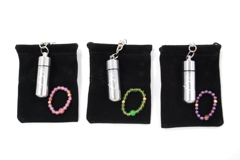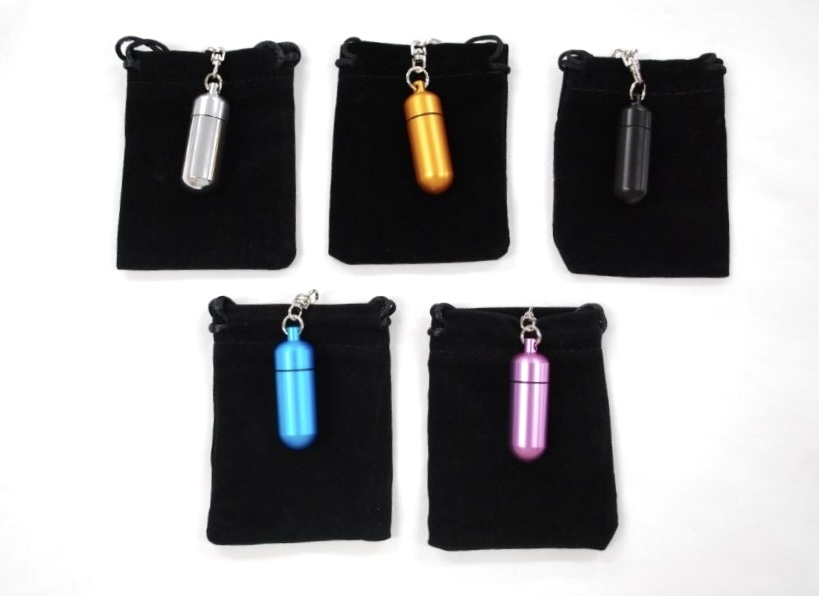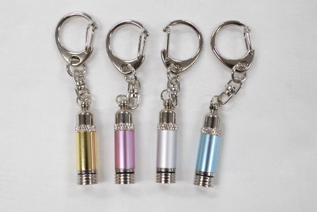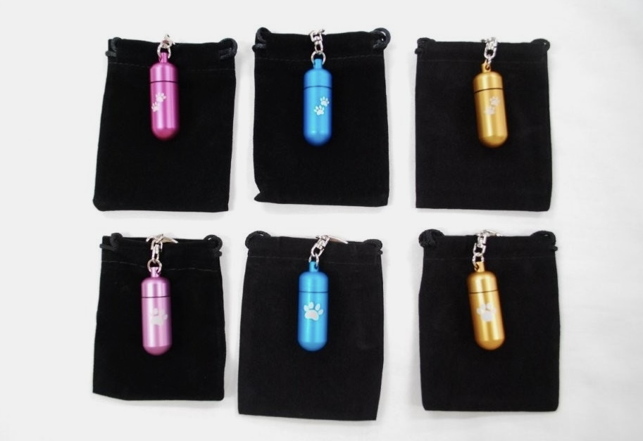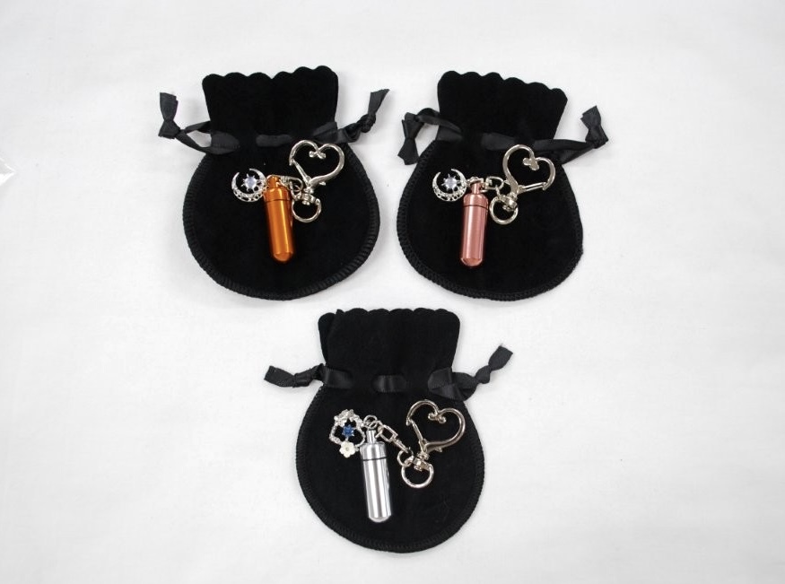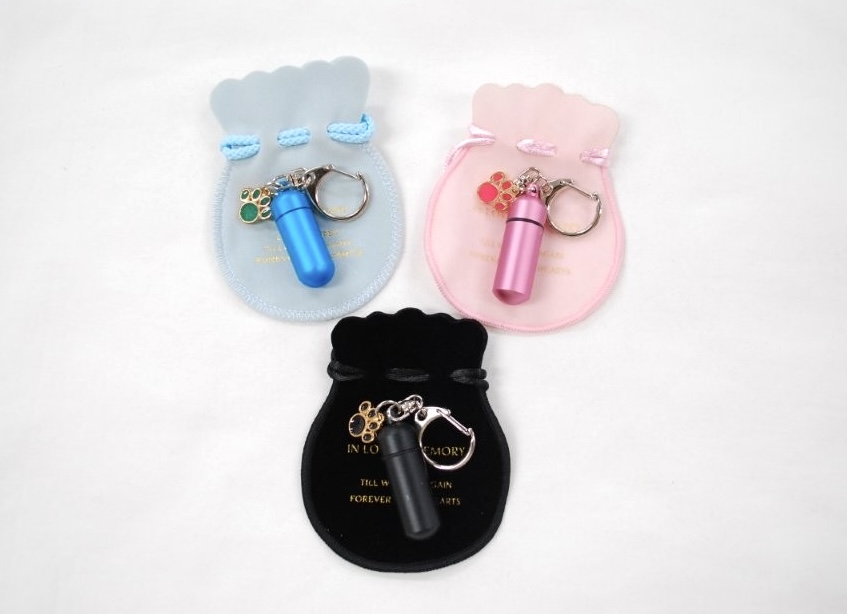 軽くて錆びにくく耐久性に優れたアルミ素材と、丈夫で錆びづらい真鍮素材を組み合わせた特別な作りのカプセルキーホルダーです。しっぽや足の先の小さなお骨などを入れて肌身離さずそばにいたい方に人気です。カプセルを守る巾着付き。シルバー、ブルー、ピンク、ゴールド、ブラックの4色。
