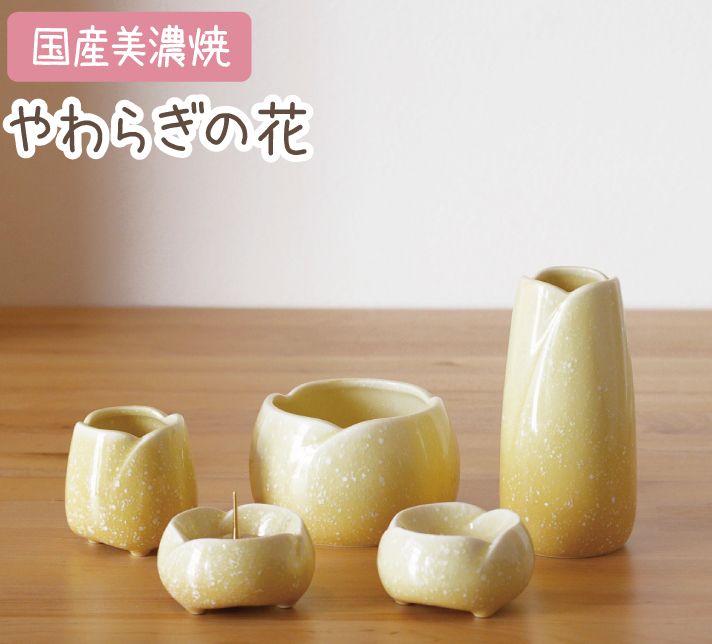毎日のご供養に必要な仏具5点セットです。花びらをイメージした丸みのあるデザインと、あたたかみのあるグラデーションが特徴です。やわらぎシリーズのシリコン骨壺と揃えるのもお勧めです。カラーはイエローとブルーの2色。