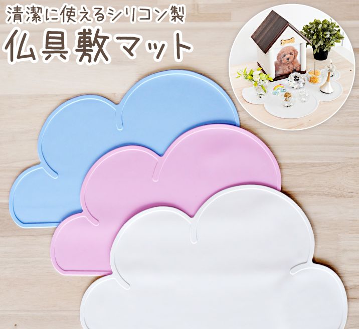 ペット仏壇やペット仏具に合わせてお使いいただけるかわいい雲形の敷物です。これ一つでご供養の場をかわいくしてあげられます。傷をつけたくない大切な場所にもお使いください。(ホワイト、ブルー、ピンクの3色)